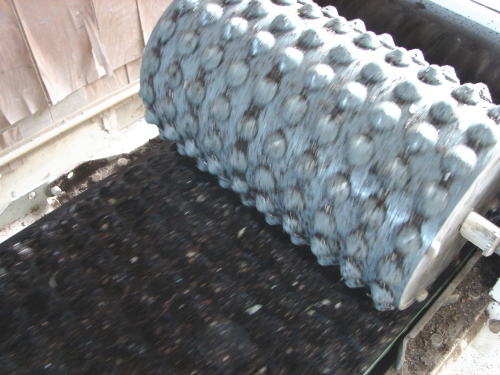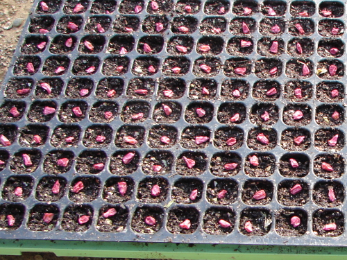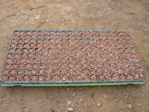 普通なら全部買うものですが、当農園ではキャベツの時使用して、小さくて悪い苗や発芽しなかったセルの土を乾燥させて取っておいて使用しています。 |